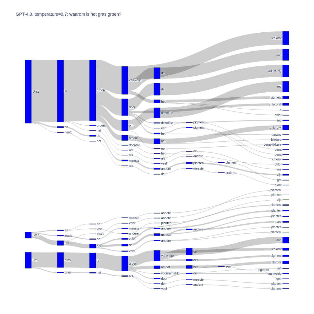 Afbeelding 2. ChatGPT heeft meerdere keuzes na elk word. Dit geeft meerde paden die leiden naar een mogelijk antwoord op je vraag.
